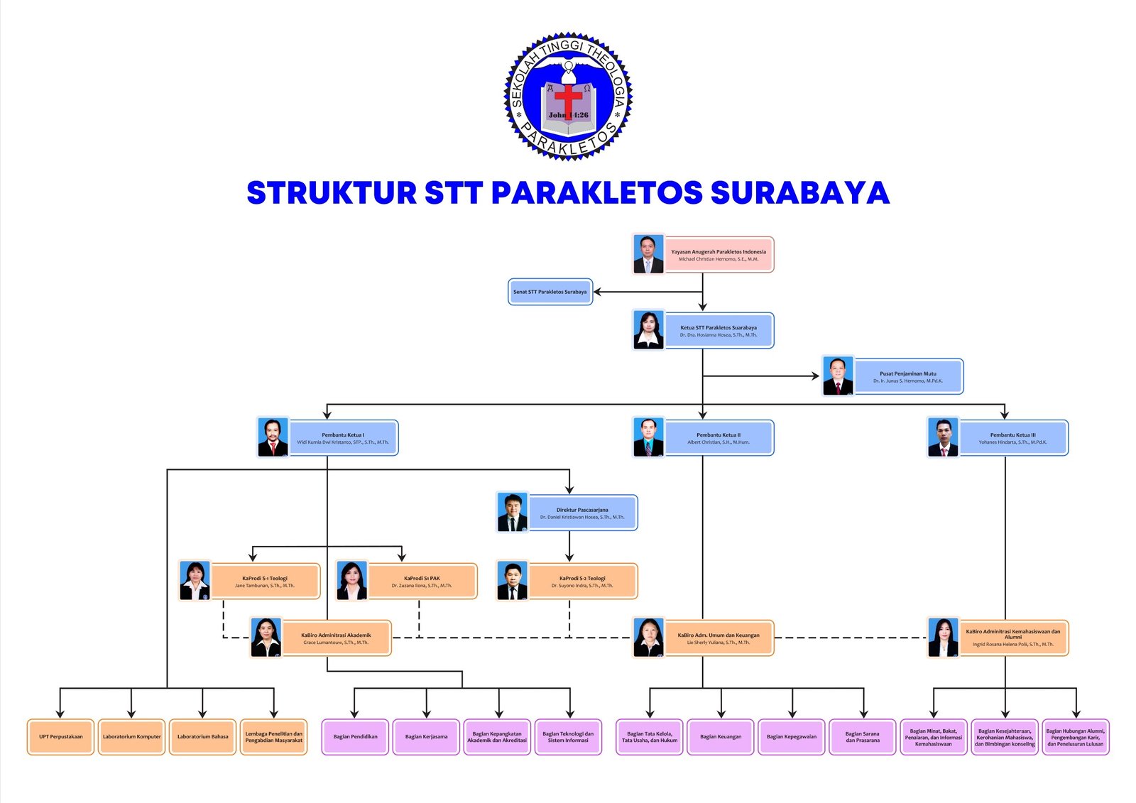 Seluruh S1 sekarang sudah terakreditasi secara Nasional di Badan Akreditasi Nasional Perguruan Tinggi (BAN-PT). Sekolah Tinggi Teologi Parakletos Surabaya terus berusaha agar lulusan-lulusan S2 hingga S3 diakui secara nasional, melalui Badan Akreditasi Nasional Perguruan Tinggi ( BAN-PT).